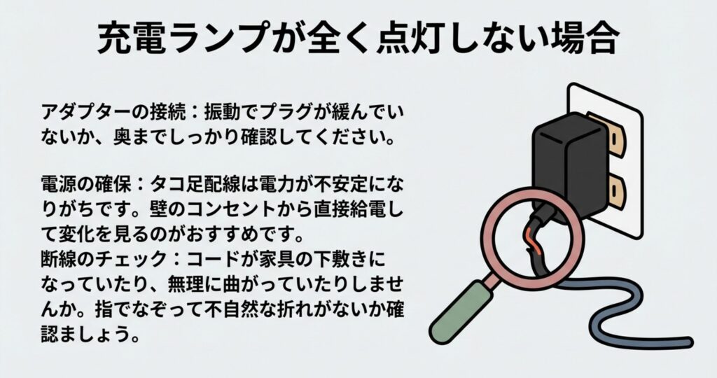 コンセントに繋いでいるのに充電ランプがつかない時、まず疑ってほしいのはアダプターの接続です。