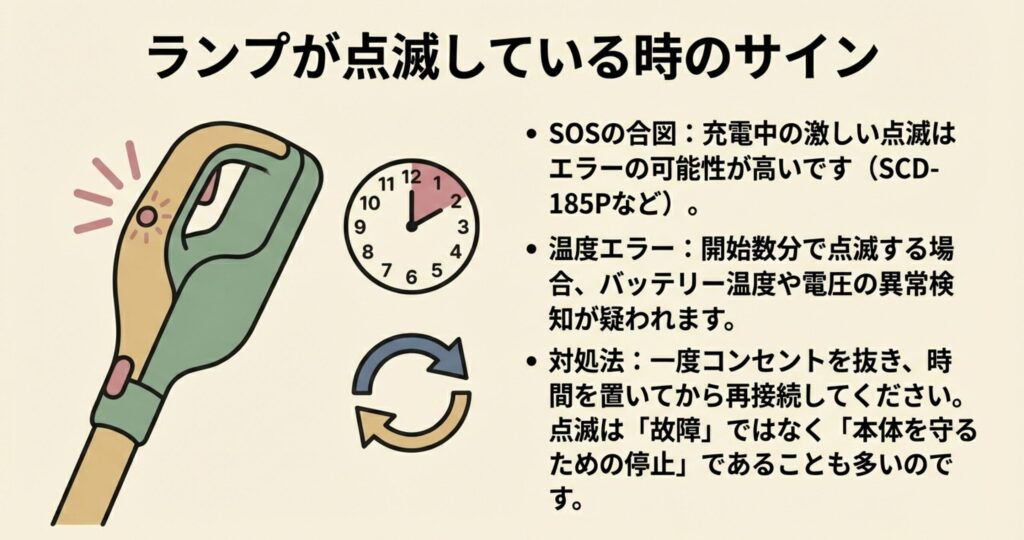 アイリスオーヤマの「SCD-185P」などのモデルでは、バッテリー残量が少なくなるとゆっくり点滅して知らせてくれる機能がありますが、これが充電中に異常に早く点滅し続ける場合は「エラー」を意味していることがほとんど。