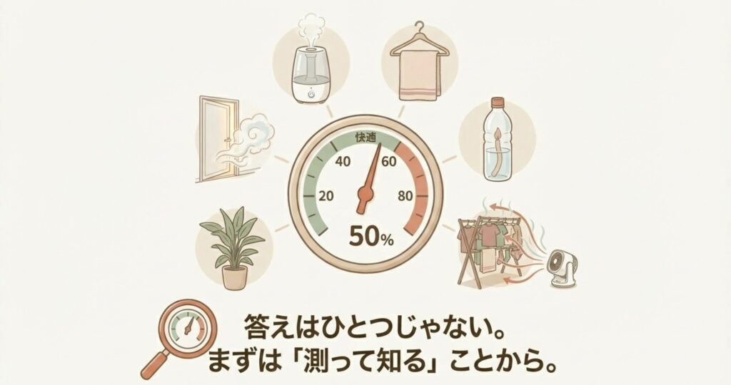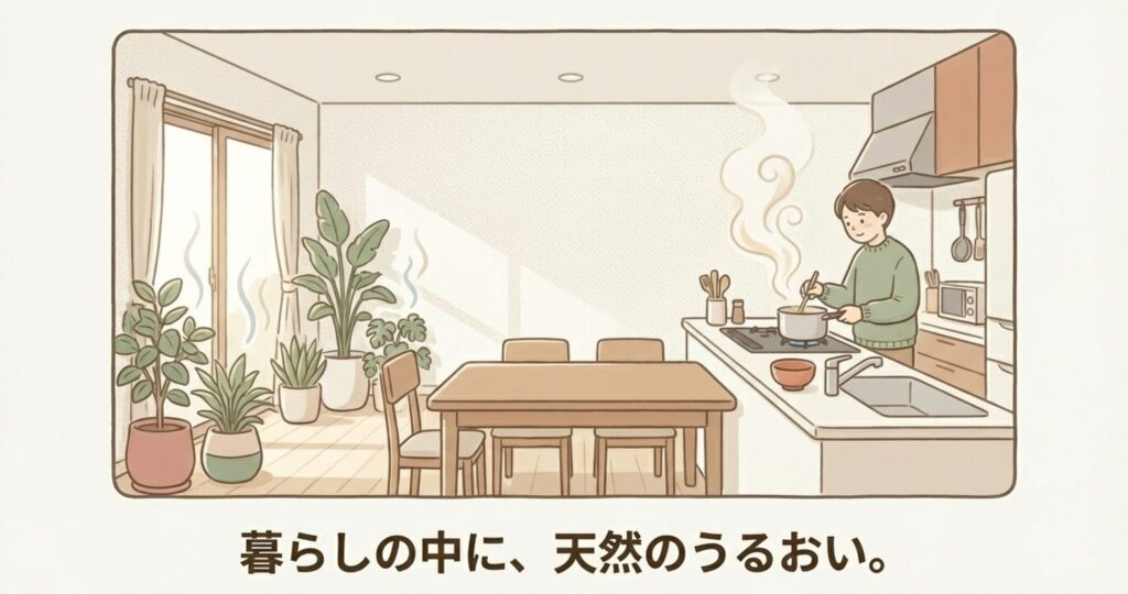 その代わりに、この後紹介する代用アイデアを組み合わせて、自分にとってストレスのない湿度管理を見つけるのが、長く続く快適な暮らしのコツですよ。