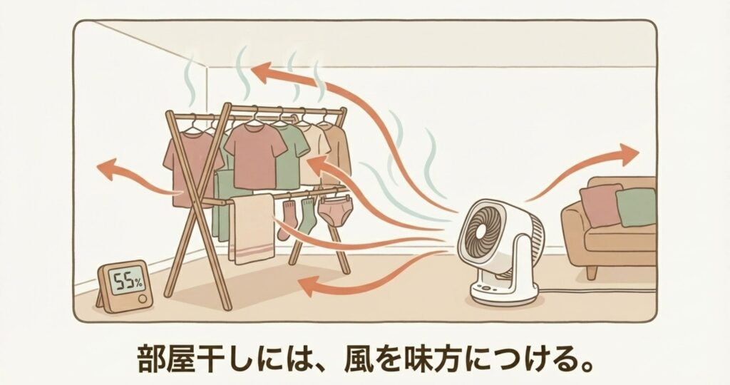 部屋干し加湿を成功させるコツは、空気を動かしてあげること。