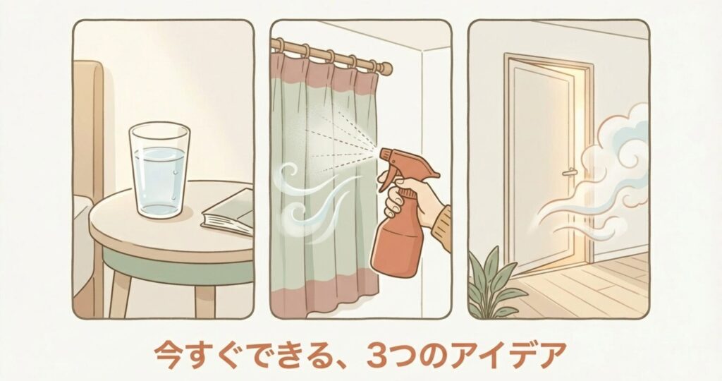 また、霧吹きでカーテンにシュシュっとお水をかけるのも即効性がありますよ(カビない程度にね!)。