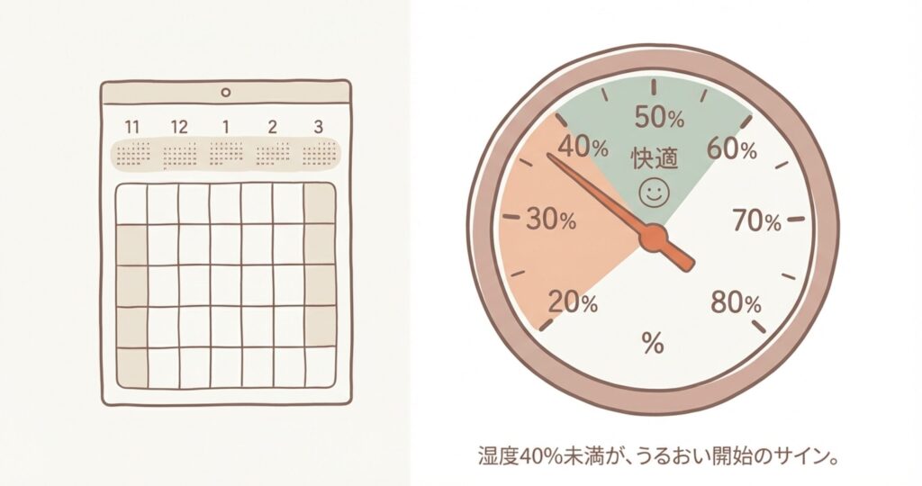 加湿器をいつから使うかの目安をもう少し詳しく知りたい場合は、加湿器はいつから使う?何月から準備して湿度何パーセントが目安かも参考になります。