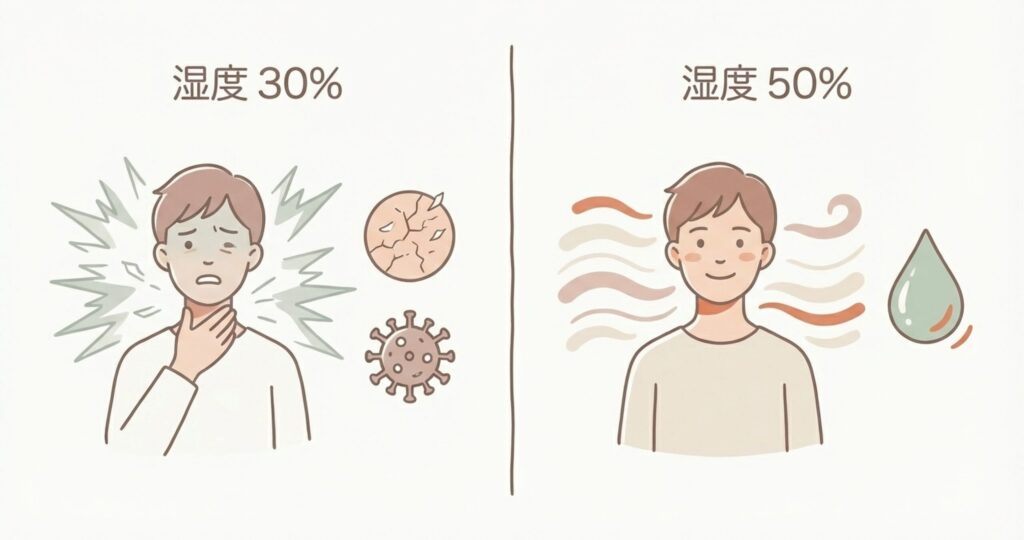 湿度が40パーセントを下回る状態が続くと、まず呼吸器の粘膜が乾燥しやすくなります。