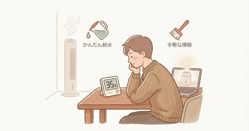 | 一人暮らし・忙しい人 | 必要に応じて | お手入れ不要のスチーム式、ペットボトル式 |