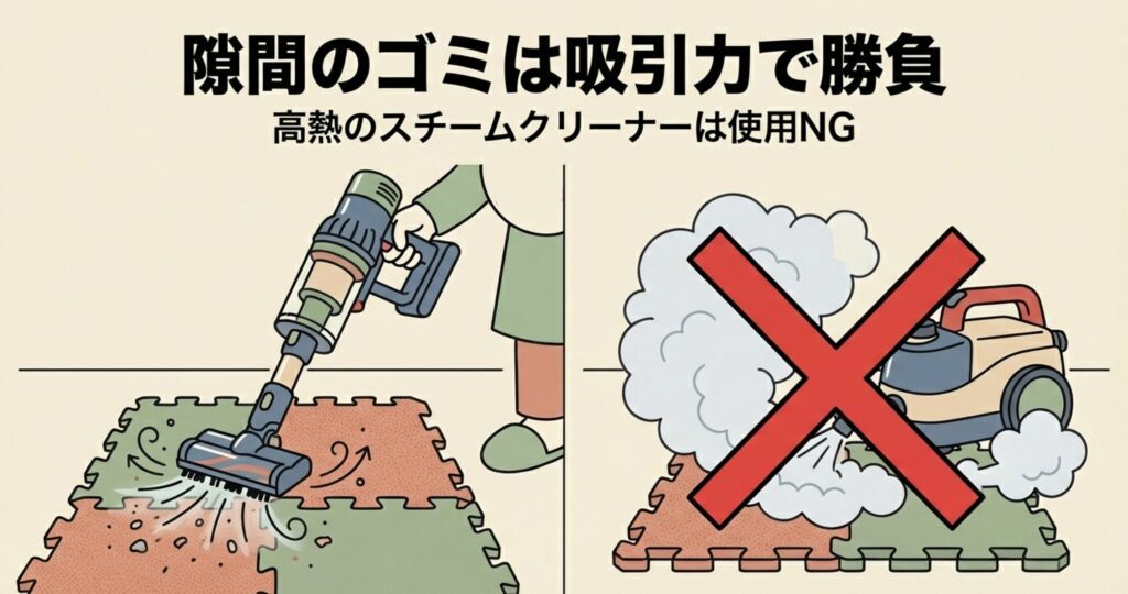 最近は、マットの隙間に入り込んだ小さなゴミも強力に吸い取るコードレス掃除機が必須アイテム。ダイソンのような吸引力が高いモデルなら、ジョイント部分に溜まったホコリも一気に綺麗にできます。