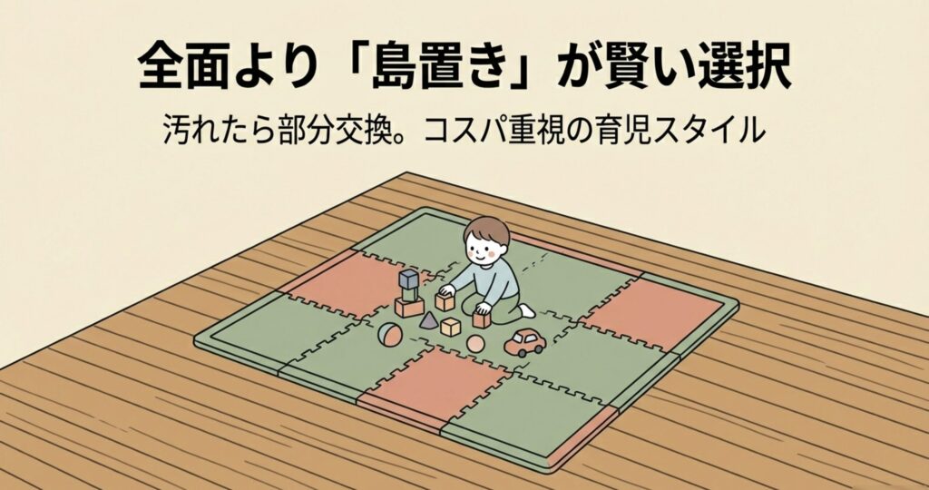リビング全体に敷き詰めるのは大変ですが、テレビの前やキッズスペースなど、滞在時間の長い場所だけ「島」を作るように設置するのもありですよ。