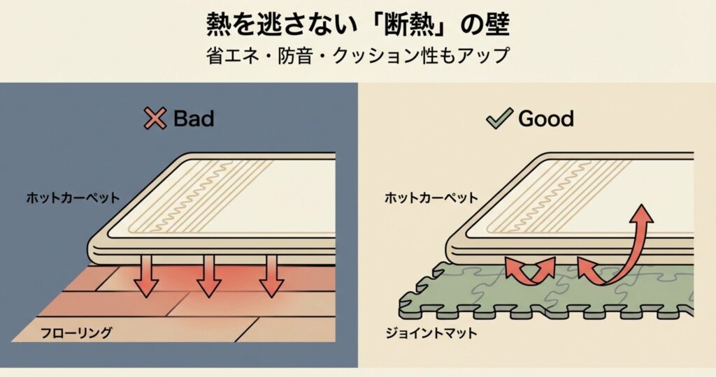 私のお店でもよくお話しするんですけど、ジョイントマットとホットカーペットを併用する最大のメリットは、圧倒的な断熱効果とクッション性にあるんです。
