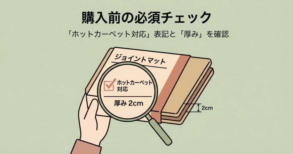 ジョイントマットを新しく買うなら、絶対に「ホットカーペット対応」の表記があるものを選んでください。店頭でも、安いからといって適当なマットを選んでしまい、後で後悔するお客様を何人も見てきました。