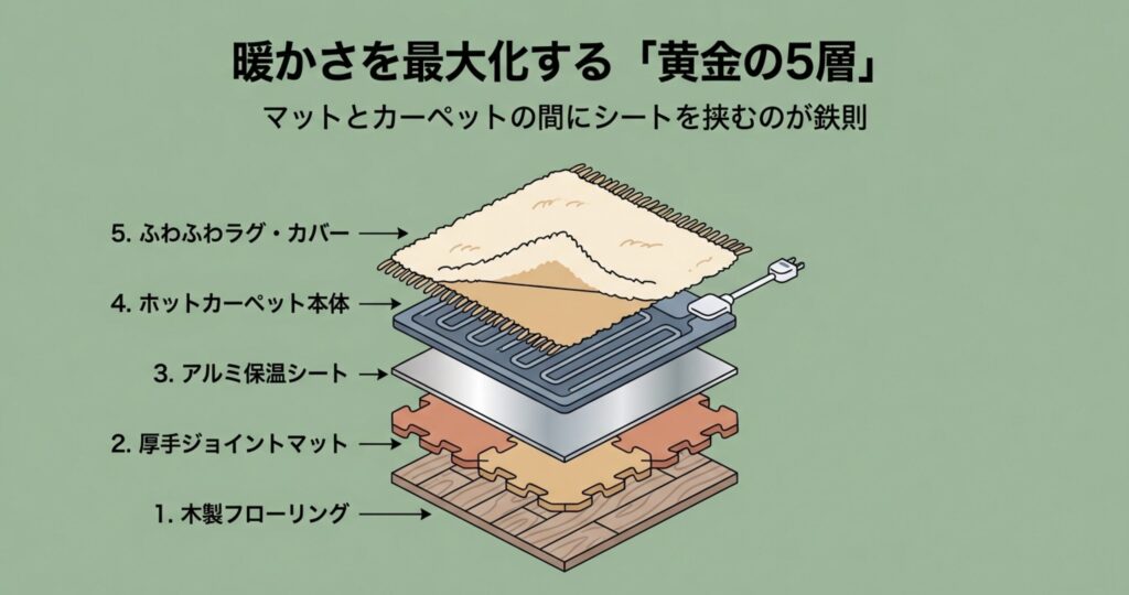 まず一番下はフローリング、その上に「ジョイントマット」、次に「アルミ断熱シート」、そして「ホットカーペット本体」、最後に「ラグやカバー」という並びが最強です。