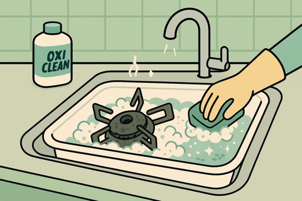 洗い桶の中でお湯とオキシクリーンを溶かし、そこに五徳などを浸ければ、シンク本体が溶液に直接触れることはありません。これなら安全ですよね。