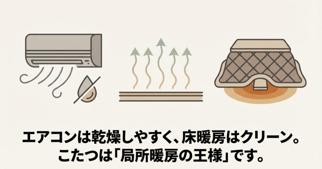 こたつ、エアコン、床暖房の比較