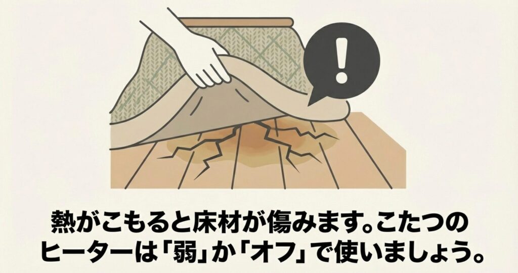 | こたつヒーター | 基本オフ、必要な時だけ「弱」 | 床材のダメージ防止 |