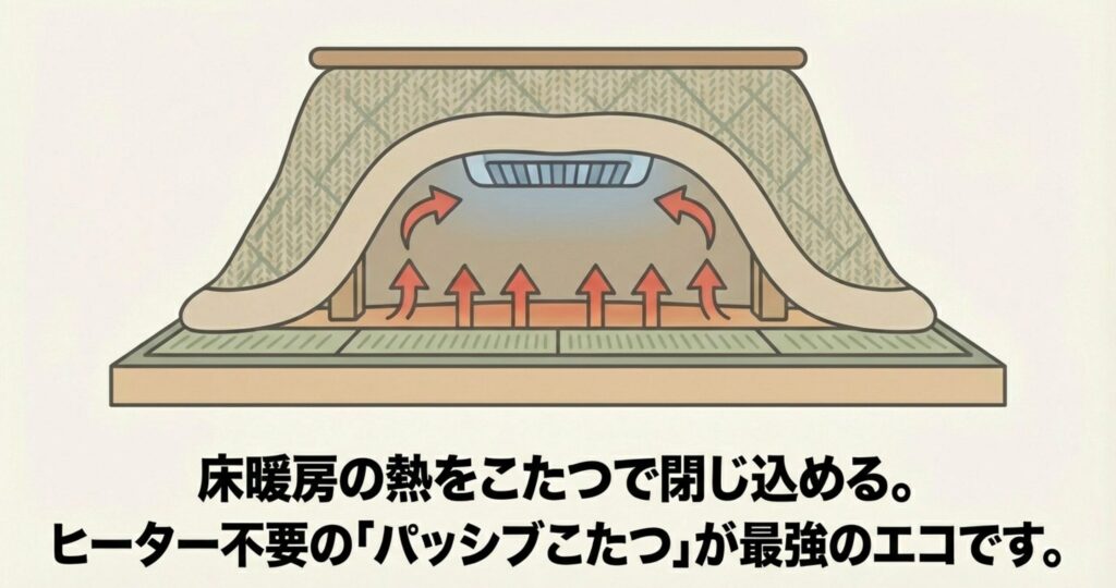 通常、床暖房だけでポカポカしようとすると設定を上げがちですが、こたつを置いてその中に熱を閉じ込めれば、低い設定温度でも十分温かく感じます。