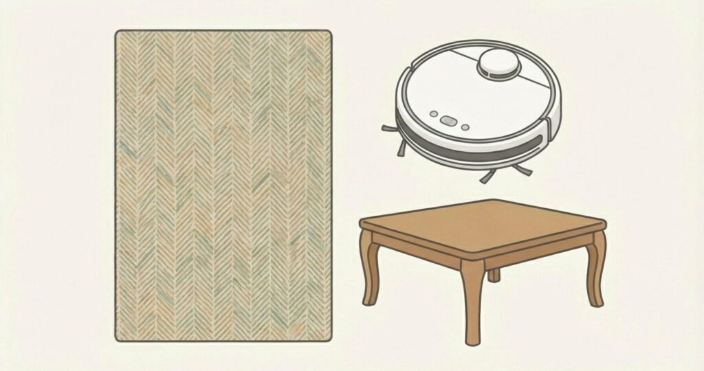 このラグの上に、お気に入りのこたつテーブルと布団をセットすれば、あっという間に「電気代ゼロ(こたつ側)」のパッシブこたつが完成します。