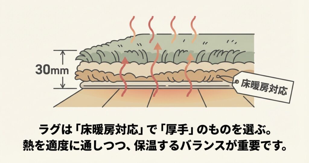 床暖房の熱を活かして「こたつ風」に仕上げるには、ラグ選びが全てと言っても過言ではありません。