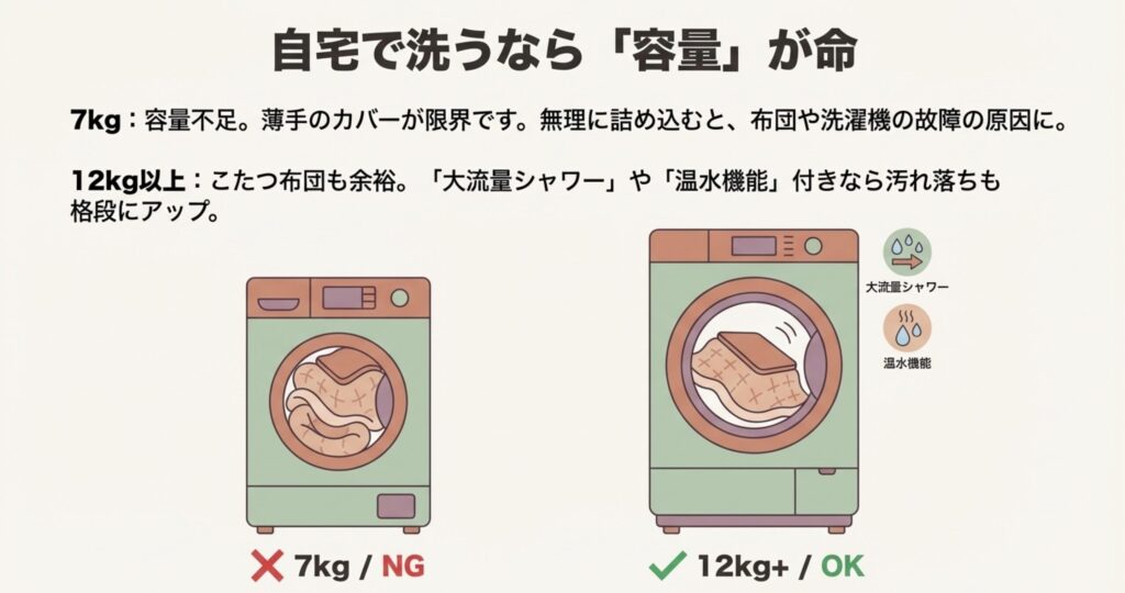 もし「これからは家で大物も全部洗いたい!」というなら、12kg以上の大容量モデルへの買い替えがおすすめです。12kgあれば、毛布やこたつ布団も余裕を持って洗える機種が増えてきます。