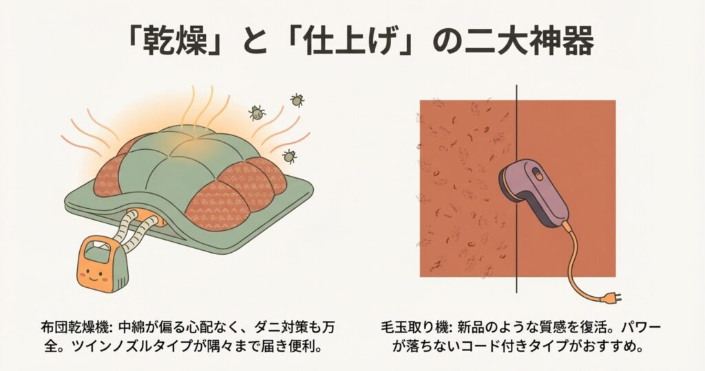 | 乾燥 | 中温以下で追加乾燥を推奨 | 布団乾燥機(カラリエなど)活用 |