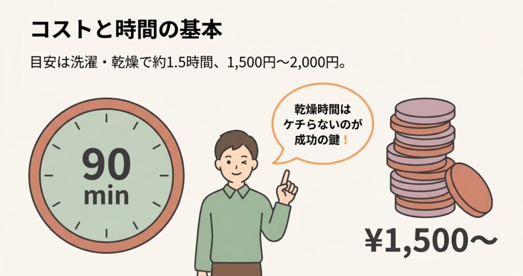 コインランドリーでこたつ布団を洗うとき、まず気になるのがコストと拘束時間ですよね。