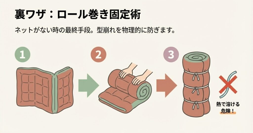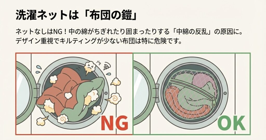 ネットを使わずに洗うと、洗濯機の強力な水流で布団が暴れ、中の綿がちぎれたり一箇所に固まったりする原因になります。
