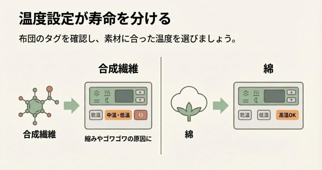 これらの素材は熱に弱く、70℃から80℃を超える高温で長時間回すと、表面のフリースが溶けてゴワゴワになったり、布団全体が縮んで「寸足らず」になったりします。