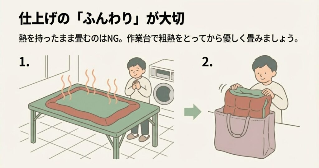 こたつ布団は厚みがある分、中心部に湿気が残りやすいんです。そのまま畳んで袋に入れると、数日後にはカビや雑菌の温床になってしまいます。