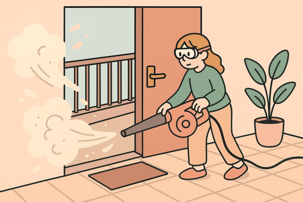 - 時短・一気に派: ブロワーで、日中に外へ一気に吹き飛ばす。