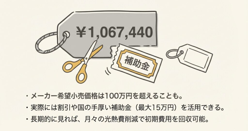 初期投資はかかりますが、毎月の光熱費削減分や手厚い補助金を考慮すれば、実は10年、15年という長い期間で見れば非常に合理的な選択なんですよ。