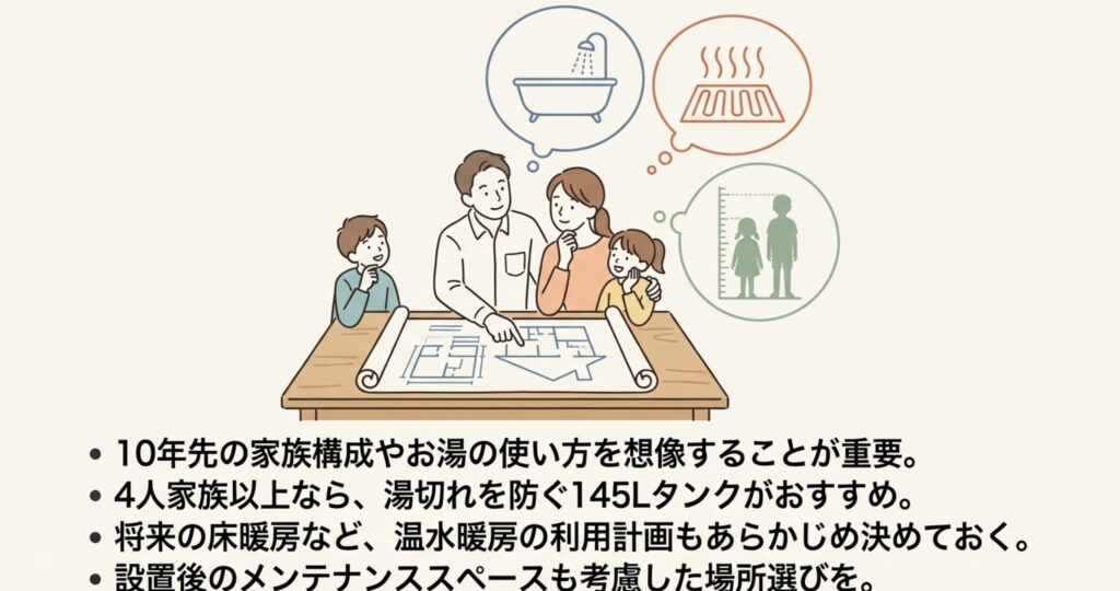 ハイブリッド給湯器選びで「あっちにすれば良かった」と後悔しないための最大のコツは、「家族全員のお湯の使い方を10年先までイメージすること」です。
