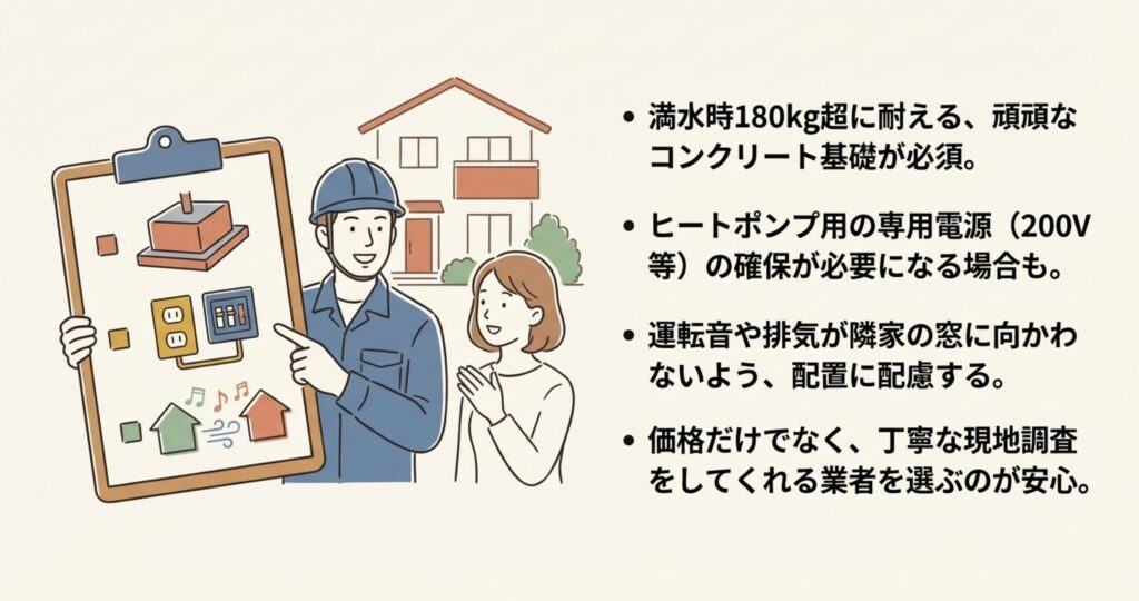 貯湯ユニットは満水時には180kgを超える重さになるので、ただ置くだけではなく、メーカー指定のコンクリート台座やアンカー固定が必須。これを怠ると、地震の際などに転倒するリスクがあり、非常に危険です。