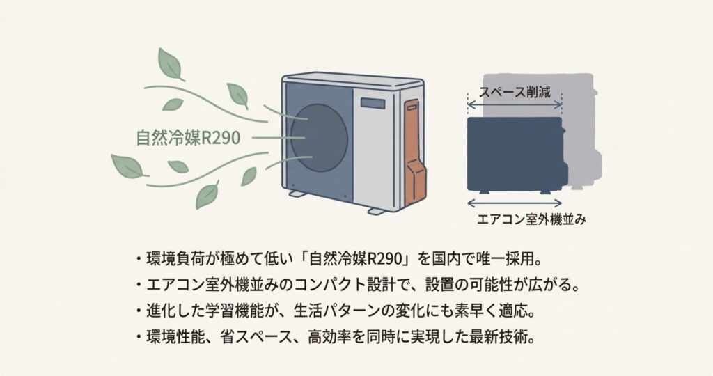 | 環境性能 | 自然冷媒R290を国内唯一採用 | 地球温暖化への影響が極めて低い |