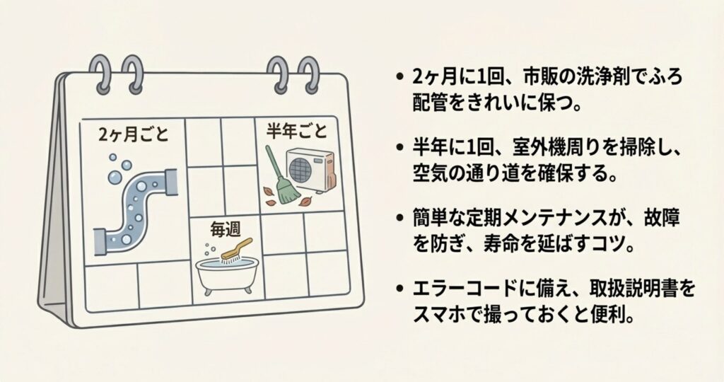 - 室外機周辺の清掃:半年に1回(通気確保)