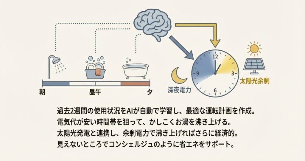 そのデータをもとに、最も電気代が安い時間帯や、気温が高くて効率よく沸かせる時間を狙ってお湯を準備してくれるんです。