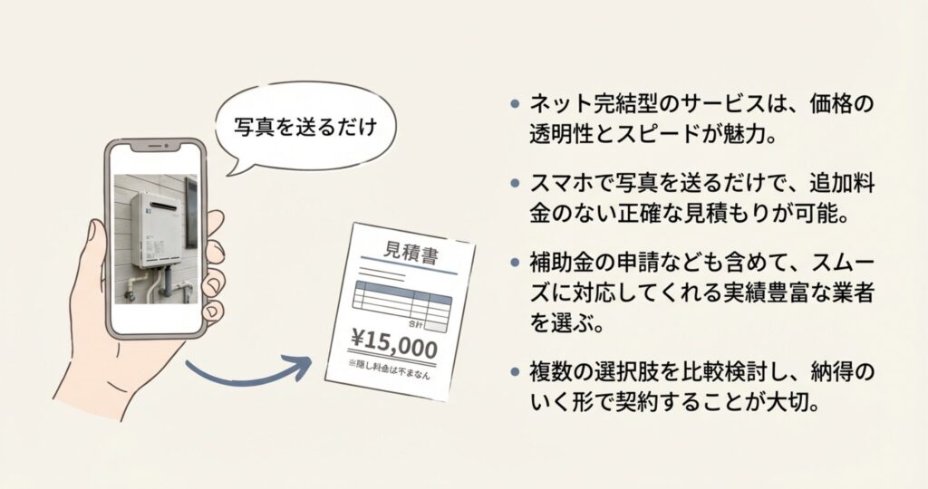 スマホで今の給湯器の写真を数枚撮って送るだけで、追加費用のない正確な見積もりが届くのは、忙しい方には本当にありがたいですよね。