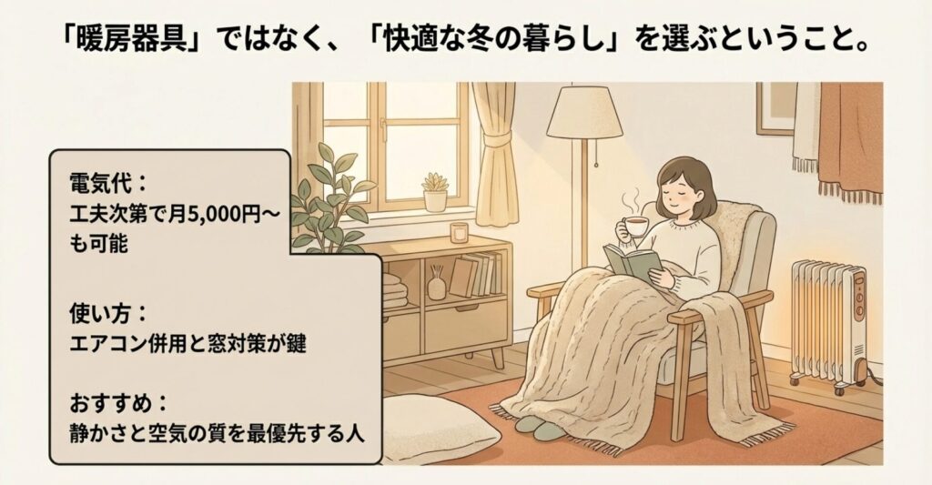 オイルヒーターは、単なる暖房器具というより、「質の高い冬の暮らし」を買うものだと私は思っています。