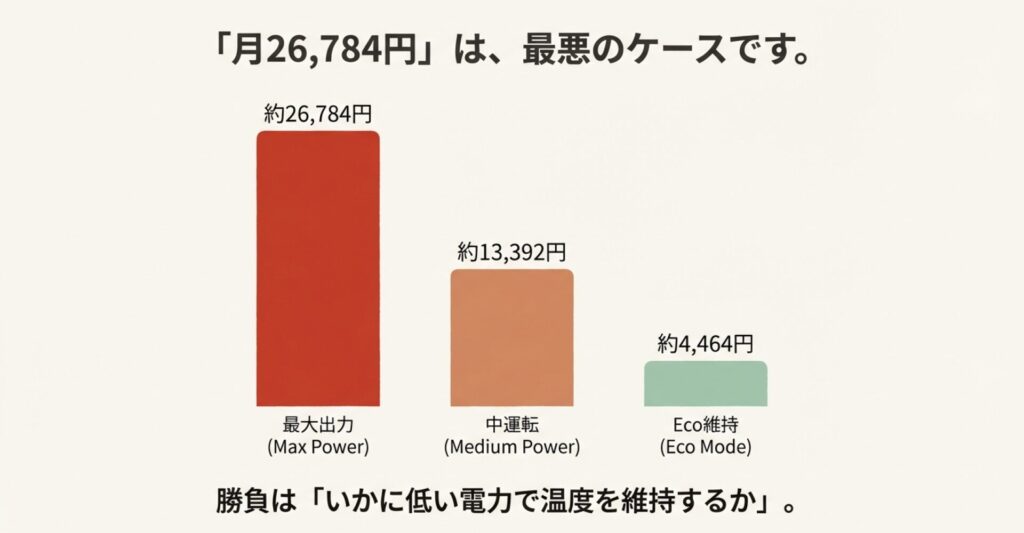 うまくEcoモードなどで温度維持ができれば、月額5,000円以下に抑えられる可能性もあるんです。