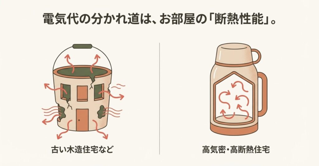 オイルヒーターの電気代が「天国」になるか「地獄」になるかは、あなたが住んでいるお部屋の「断熱性能」でほぼ決まってしまうんです。