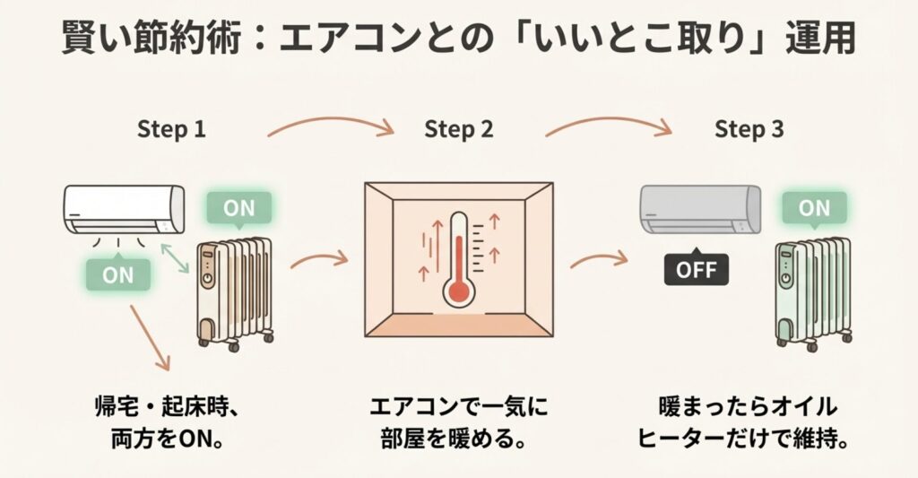 - Step 3: 部屋が暖まったらエアコンをOFFにし、オイルヒーターのみで温度を維持する。