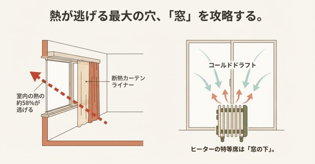 窓の下にヒーターを置くと、ヒーターから立ち昇る暖かい空気(アップドラフト)が冷気をブロックして、「ヒートカーテン」の役割を果たしてくれるんです。これだけで体感温度が全然違いますよ。