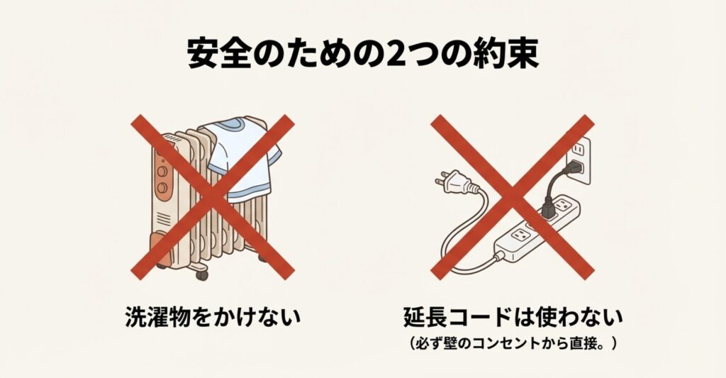 オイルヒーターで一番やってはいけないこと、それは「本体に洗濯物をかけて乾かすこと」です。これ、本当に危険なので絶対にやめてくださいね。