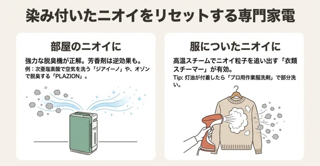 正直なところ、普通の芳香剤を置いてもニオイが混ざって余計に変なニオイになってしまうことが多いんです。ここはパワーのある脱臭機に頼るのが正解です。