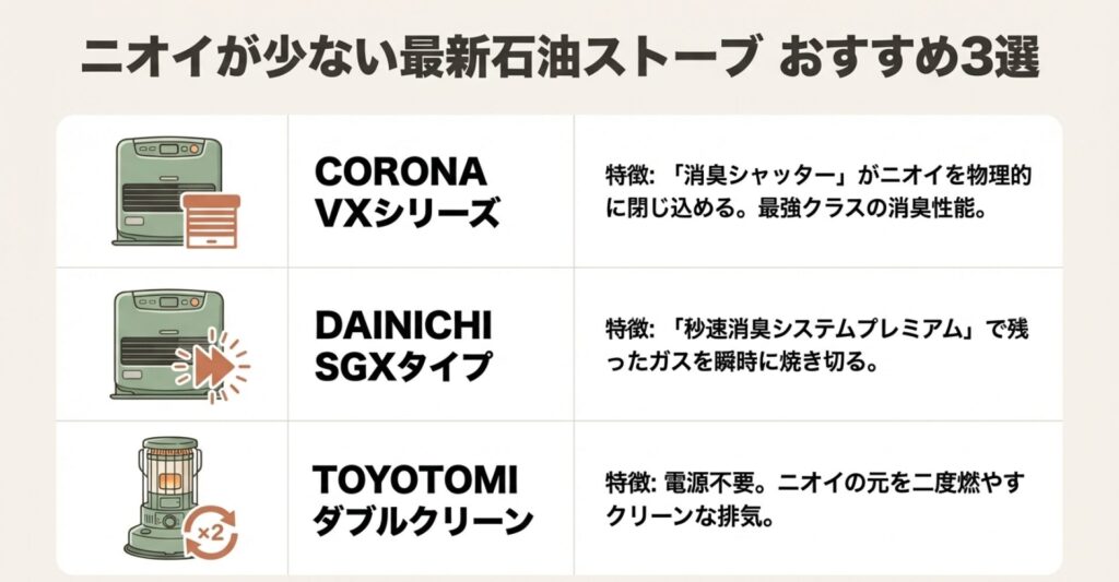 ファンヒーターならコロナのVXシリーズかダイニチのSGX、電源のいらない反射式ならトヨトミのダブルクリーンシリーズを選べば間違いありません。