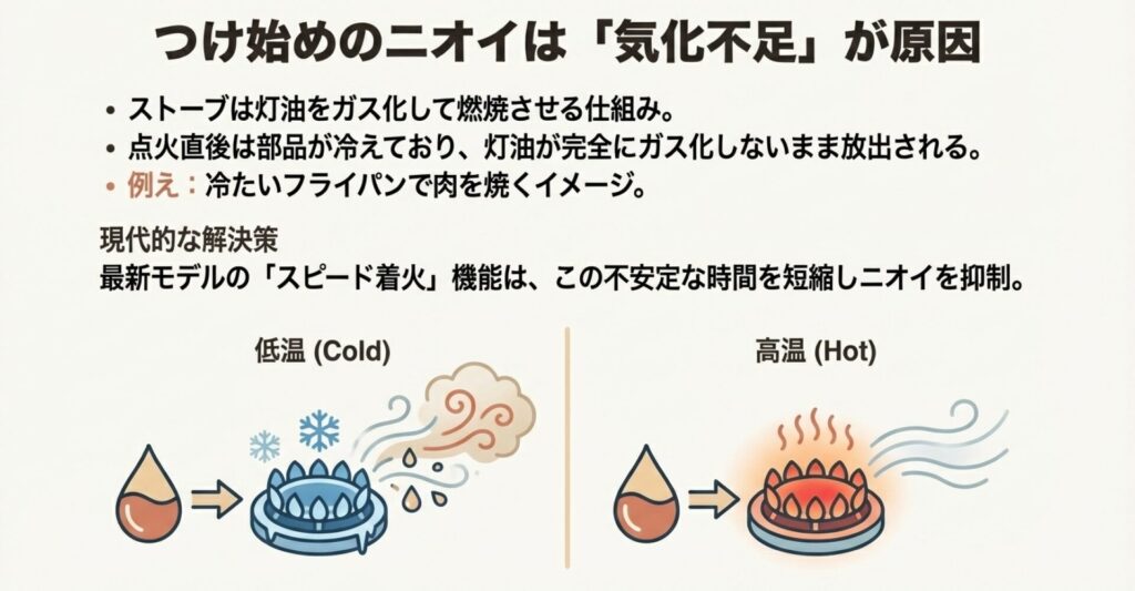 でも、点火したばかりの時はまだバーナーや燃焼筒といった部品が冷え切っていますよね。この冷えた状態で燃料が送り込まれると、灯油が完全にガスになりきれず、液体の粒や中途半端に分解された成分のまま空気中に放出されてしまうんです。