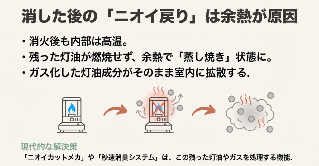 火は消えているので、当然ながら燃焼(酸化反応)は止まっています。でも、内部に残ったわずかな灯油が余熱で蒸され、「蒸し焼き」状態になってしまうんです。
