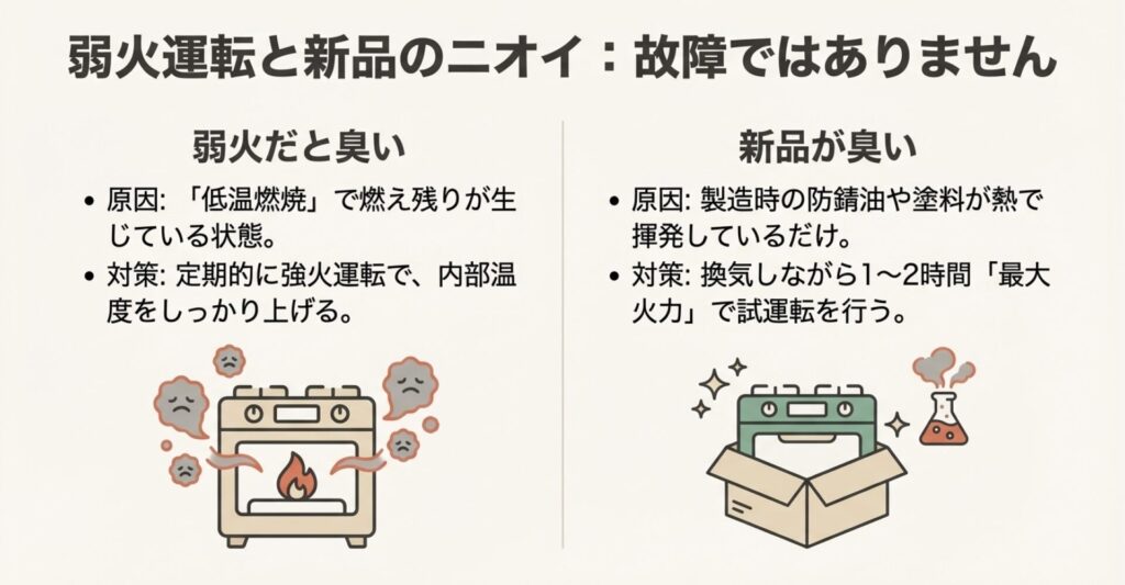 初めて点火した時の熱で、これらの成分が揮発したり、塗料が焼き固まったりする際に、独特の化学的なニオイが発生するんです。