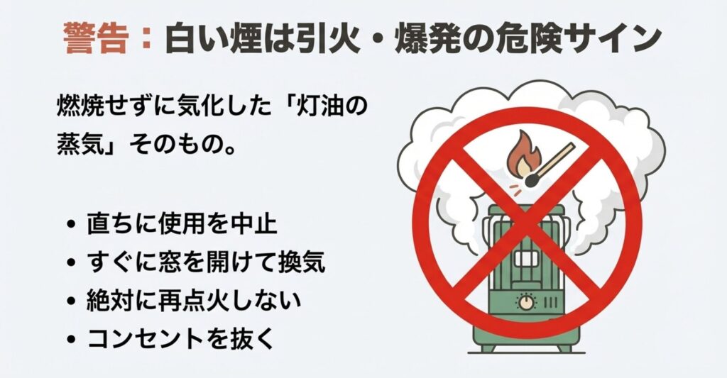 この白い煙の正体は、燃焼せずに気化だけしてしまった「灯油の蒸気」そのものです。