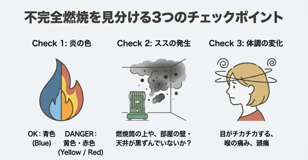 不完全燃焼は一酸化炭素(CO)という無色無臭の猛毒ガスを発生させるため、ニオイだけでなく視覚的なサインも見逃さないようにしましょう。特に、換気が不十分だと酸素不足で不完全燃焼になり、CO濃度が上昇するおそれもあります。