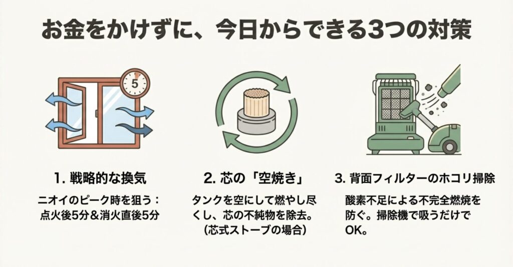 消火前後の換気を習慣にする具体的な手順は、石油ストーブの換気方法と適切な頻度でも詳しく解説しています。