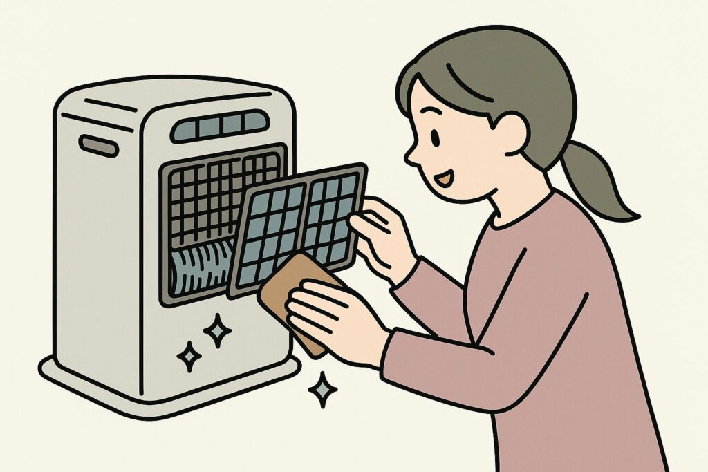 「換気サイン」がすぐ出るようになったら要注意。週に一回、掃除機で吸うだけで全然違いますよ。ダイニチの上位機種なんかは、スライドするだけで掃除できる機能がついてて便利です。