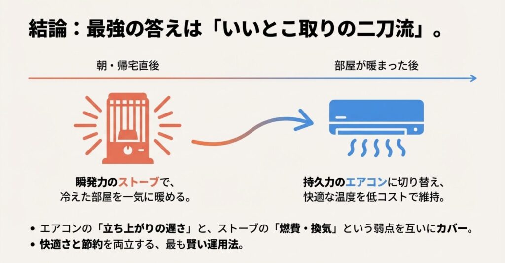 「瞬発力のストーブ」+「持久力のエアコン」。この組み合わせが、快適さと安さのバランス最強です。
