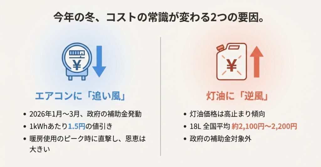 正直なところ、2025年の冬は答えがちょっと複雑なんですよね。電気代はじわじわ上がっているけれど、2026年の年明けからは補助金が出るというニュースもある。